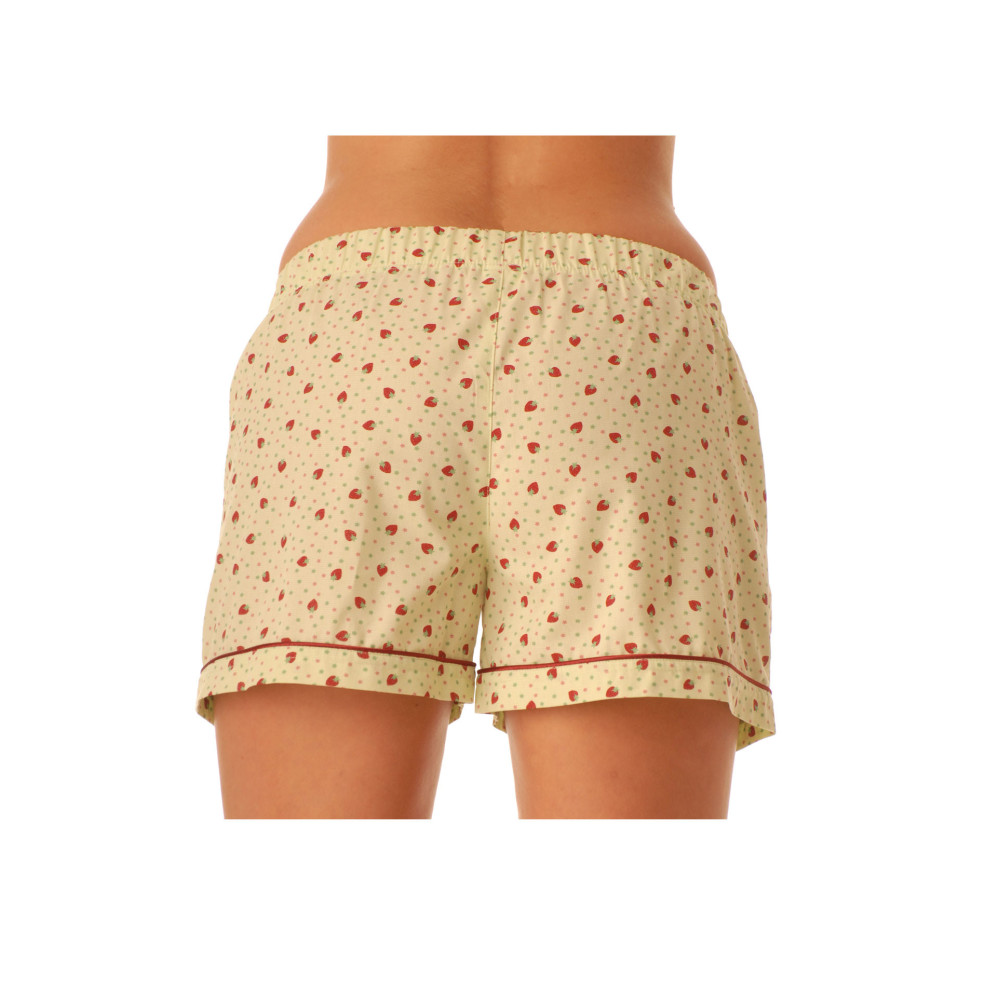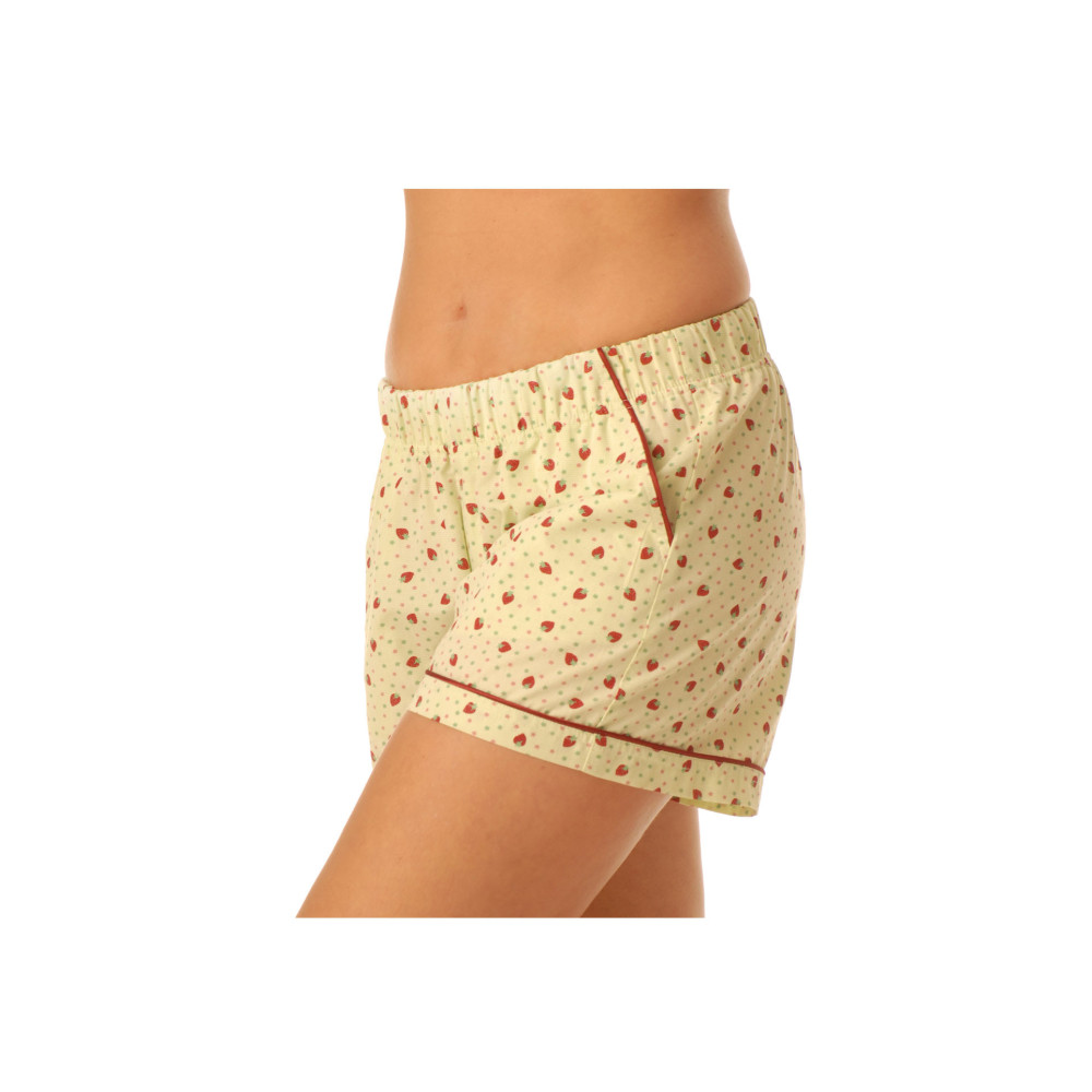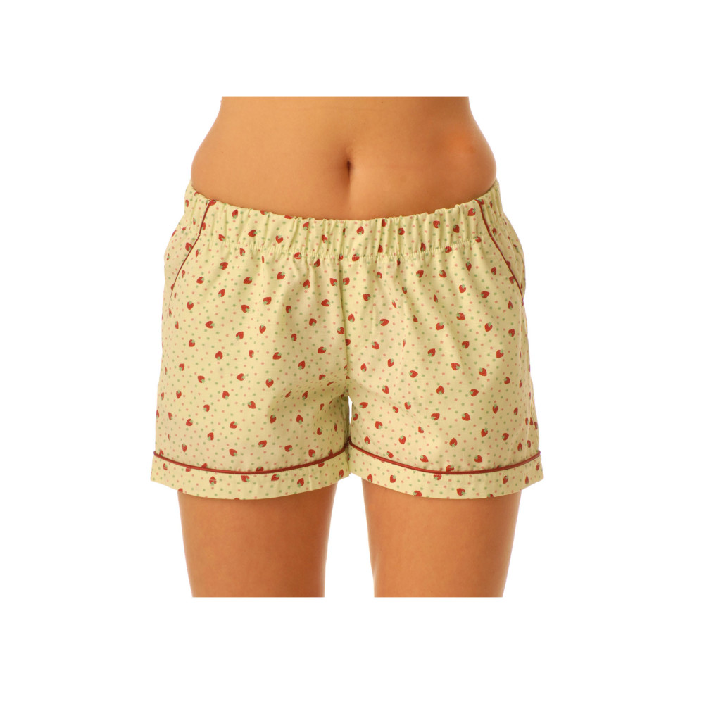 Kraťasy na spaní nebo na doma s jemným vzorkem jahůdky na světle zeleném podkladu. Kraťasy jsou doplněny kontrastním lemováním v tmavě červené barvě. Kapsy kraťasů jsou plně funkční.